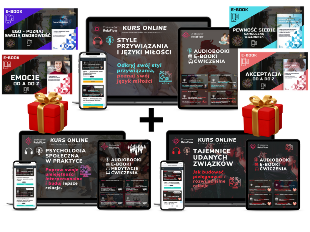 Szkolenie Psychologia Społeczna - kontakty międzyludzkie od A do Z[6 godzin szkolenia]Doskonałe relacje i swoboda wśród ludzi30 minutowy trening z Psychologii Społecznej (praktyka)Szkolenie Tajemnice udanych związków - kompletna anatomia partnerstwa[5 godzin szkolenia]Wiedza od terapeutów par z całego świata w jednym miejscu40 minutowy trening "Jak budować i rozwijać świadomy związek" (praktyka)E-book: Jak działa ego - poznaj swoją osobowośćE-book: Jak skutecznie uwalniać emocjeE-book: Samoakceptacja bez tajemnicE-book: Pewność siebie, samoocena, wizerunek i asertywnośćE-book: Przywiązania bez tajemnic