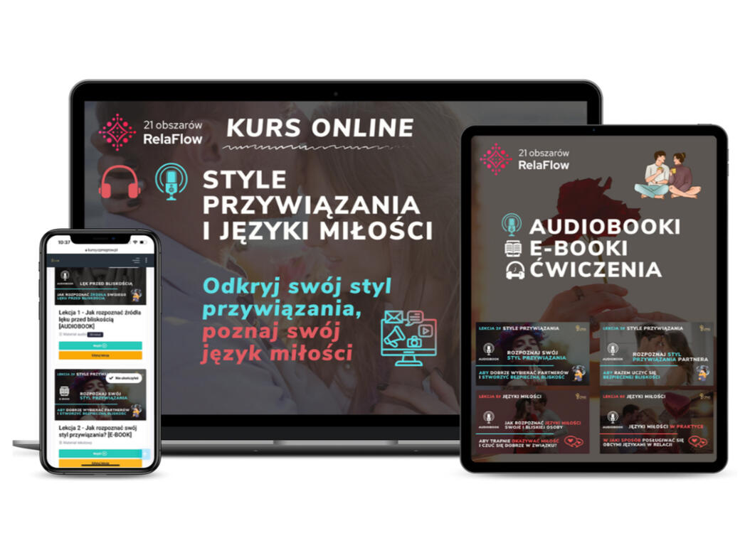 Style przywiązania i języki miłości to kurs internetowy, który składa się z 6 lekcji z wiedzą, łącznie ponad 3 godziny materiału audio oraz ponad 60 stron do czytania.